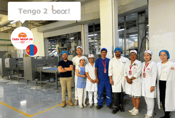 From left to right. Alberto Bozzola (Beor Area Manager), Nicolas Campesato (Baker), Pedro Valero (Beor Technician), Alberto Morato (Plant Manager) with his new fermented dough water scoring machine.