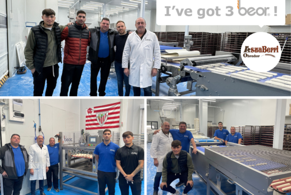 Beor’s technicians Pedro Valero and Toni Prats, beside Harry, Michael and Fabio Stinges with their new waterscoring machine of fermented dough. With CompactLeo, they will be able to score a 16 floor rack in 2 minutes and a half and make a great variety of scoring types adapting to all kind of products and trays/boards.
